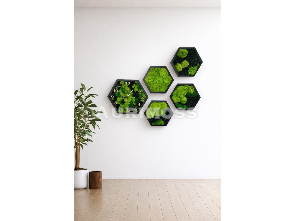 Sada machových nástenných hodín a machových obrazov – hexagónov