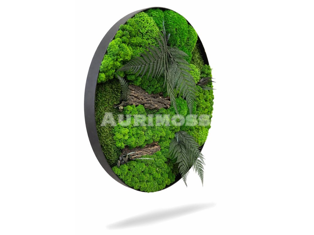 Obraz z mechu „Lesní klid“ přináší klid a atmosféru skutečného lesa přímo do vašeho interiéru. Kulatý tvar symbolizuje harmonii a rovnováhu, zatímco kombinace různých odstínů zeleného stabilizovaného mechu, přírodní kůry a dekorativního kapradí vytváří hloubku a živou strukturu.