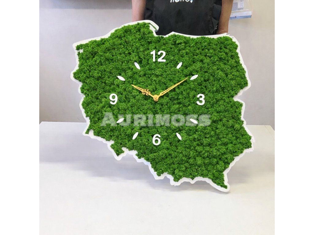 Die Moosuhr in Form der Polenkarte ist eine einzigartige natürliche Wanddekoration. Stabilisiertes Moos benötigt keine Bewässerung oder Pflege und sorgt für eine moderne und luxuriöse Atmosphäre im Raum.