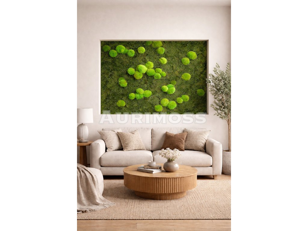 Das Moospanel Aurimoss aus Kugelmoos und Flachmoos ist die ideale Wahl für alle, die eine luxuriöse grüne Dekoration suchen, welche Design, Natur und Funktionalität mühelos vereint.
