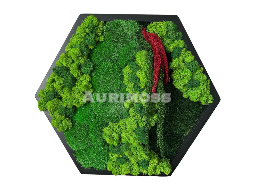 Hexagon je precízne vyrobený zo zachovaného machu a amarantu, vybraných pre harmonické spojenie farieb a textúr. Mach je bezúdržbový a zachováva si svieži vzhľad.
