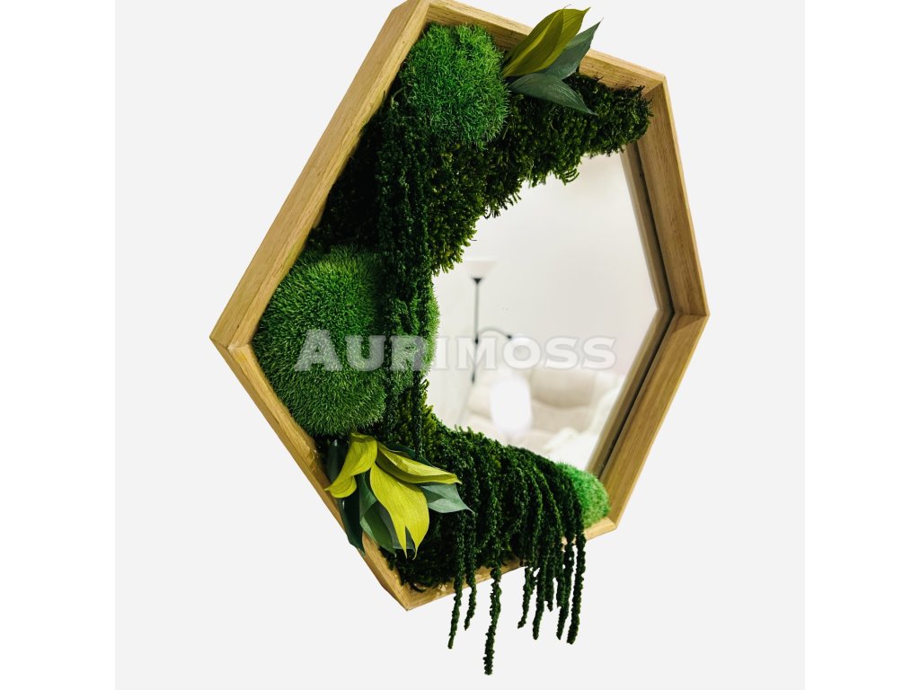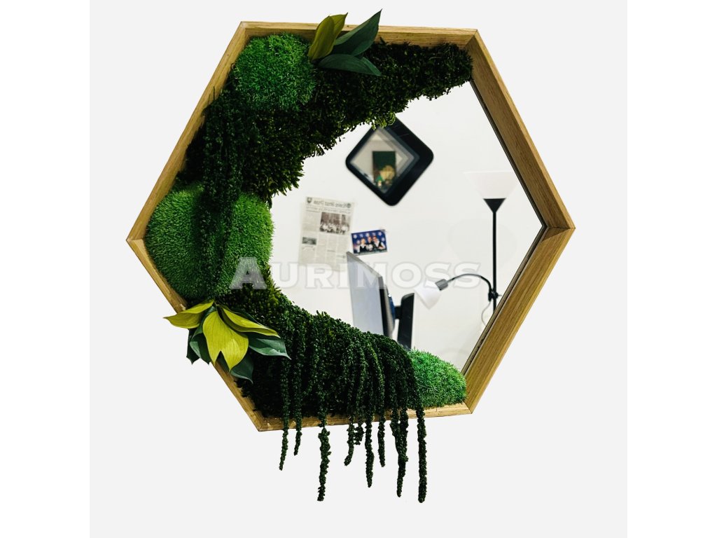 Hexagonové machové zrkadlo je symbolom spojenia moderného dizajnu s krásou prírody. Prineste do interiéru kúsok zelene bez náročnej údržby a doprajte svojej stene jedinečný vzhľad.