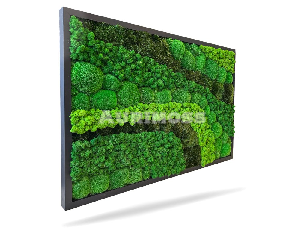 Hranatý machový obraz Lesná Fantázia je ručne vytvorený dizajnový prvok, ktorý spája harmóniu prírody s moderným interiérom. Kompozícia je tvorená z troch druhov stabilizovaných prírodných materiálov – kopcovitého machu, sibírskeho machu a lišajníka, ktoré spolu vytvárajú bohatú textúru, prirodzené kontrasty a vizuálnu hĺbku.