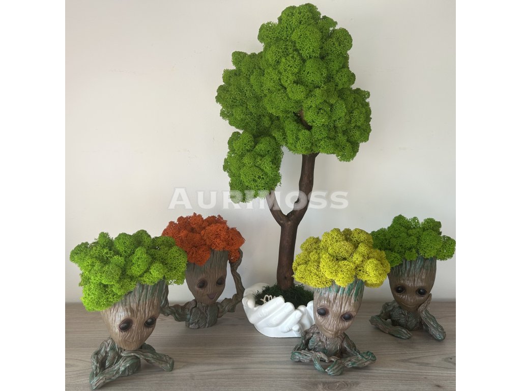 A stabilizált zuzmó mohával készült Groot stílusos dekorációs elem beltérbe. A termék magassága 17 cm. Karbantartást nem igényel, hosszú távon megőrzi élénk színét és puha textúráját. Ideális otthonba, irodába vagy egyedi ajándékként.