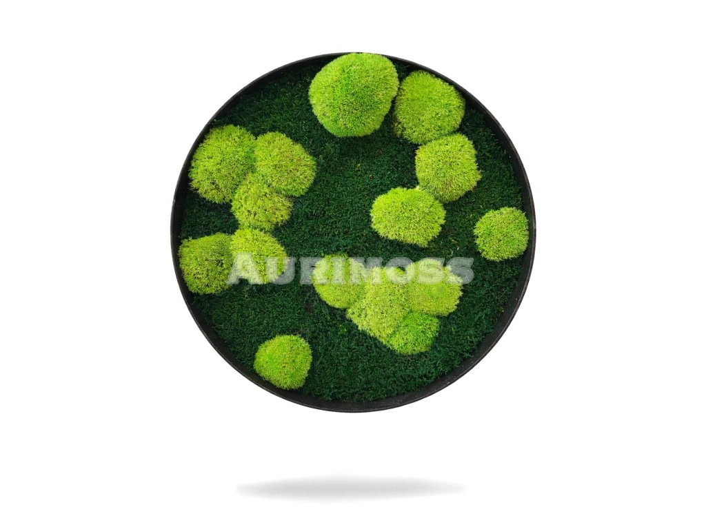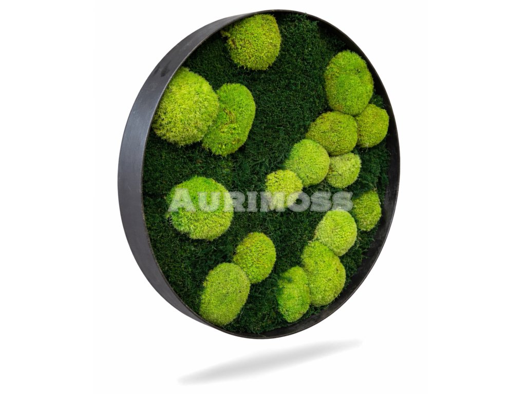 Kerek mohakép dombos és lapos mohából, természetes 3D hatással. Karbantartásmentes belső dekoráció.