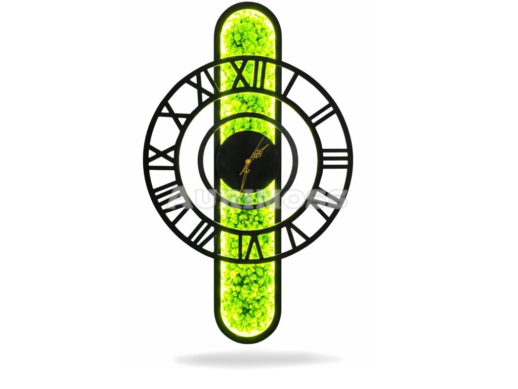 A fekete fa keret római számokkal és a stabilizált zuzmómohával alkotott kombináció modern, elegáns és időtálló megjelenést biztosít. A stabilizált moha hosszú éveken át megőrzi színét és textúráját öntözés vagy karbantartás nélkül, így ez az óra karbantartásmentes mohás fali dekoráció. Emellett javítja a helyiség akusztikáját és hozzájárul a kellemes beltéri mikroklímához.