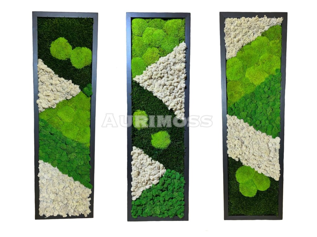 A Természetes harmónia szett három mohakép elegáns kompozíciója sötétzöld, világoszöld és krémszín árnyalatban. A természetes színek találkozása kiegyensúlyozott, nyugtató vizuális hatást kelt, és nyugalmat, frissességet, valamint a természettel való kapcsolódás érzését hozza a térbe.