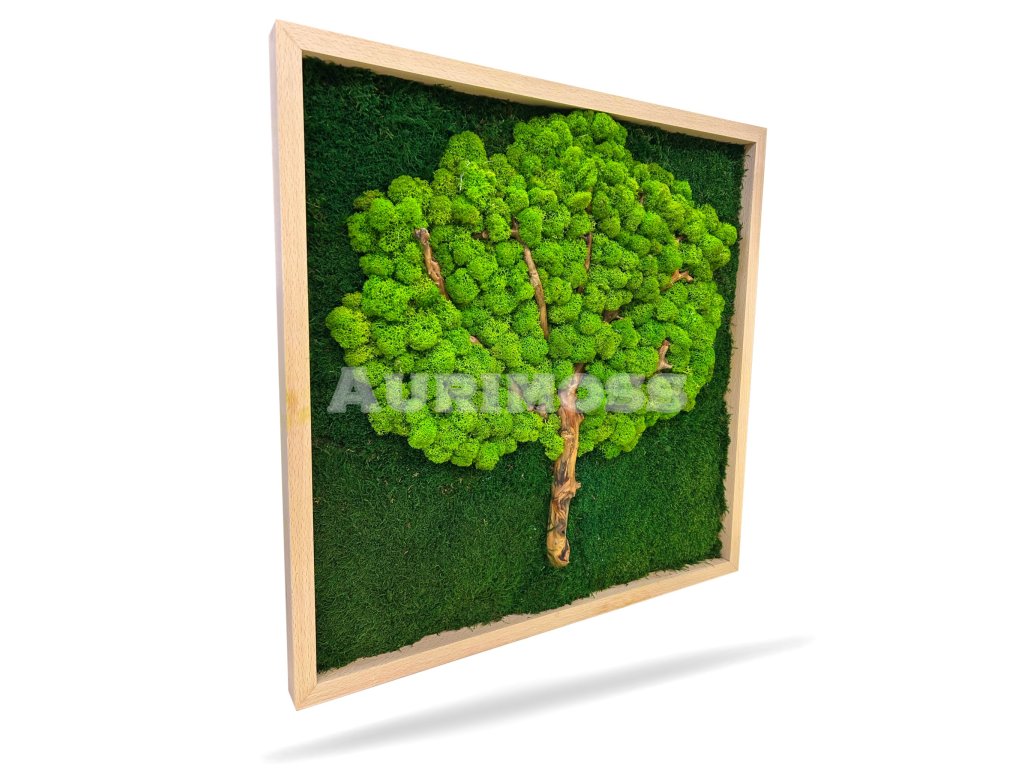 A kép stabilizált lapos mohából és zuzmóból készül, természetes fa törzzsel kiegészítve, minőségi fa keretbe foglalva.