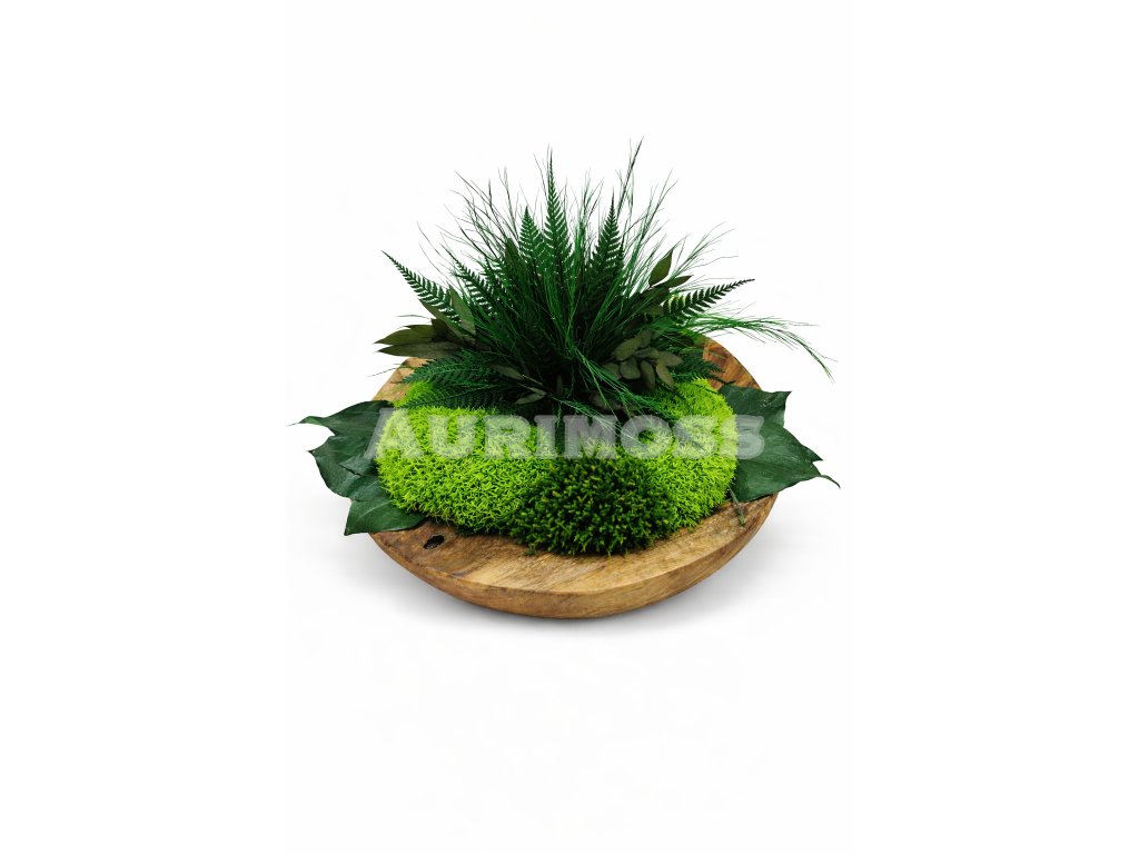 Elegantná machová miska Aurimoss s výrazným kopcom stabilizovaného machu a papraďou v masívnej teakovej miske.