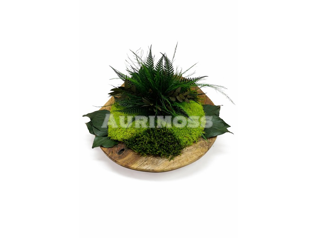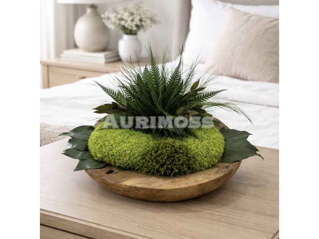 Machová miska Aurimoss „Tichý lesný kopec“ je kompozícia s dominantným kopcom stabilizovaného machu, ktorý prirodzene vystupuje z priestoru a vytvára plastický efekt. Jemná papraď dopĺňa aranžmán o ľahkosť a pohyb. Dekorácia prináša pokoj lesa do moderného interiéru.