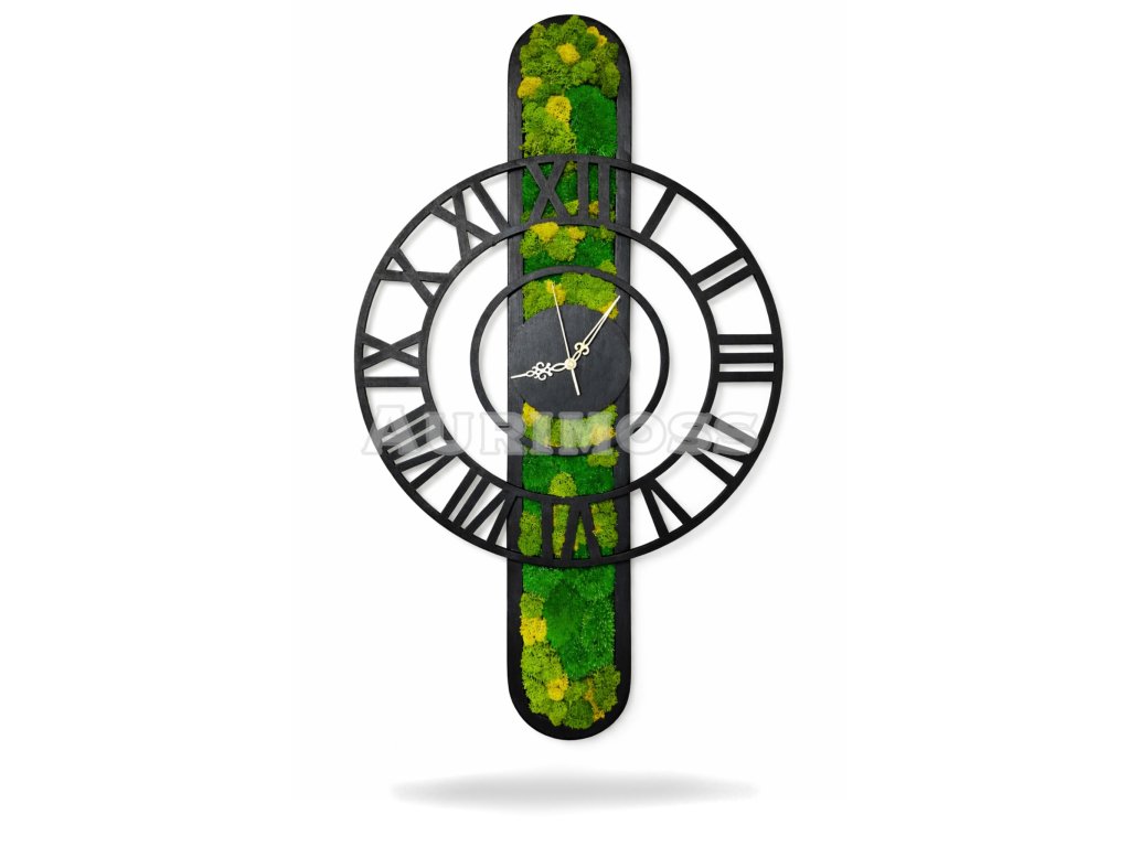 Kombinácia čierneho dreveného rámu s rímskymi číslicami a prírodného stabilizovaného lišajníkového machu vytvára moderný, elegantný a zároveň nadčasový dizajn. Stabilizovaný mach si zachováva svoju prirodzenú farbu a štruktúru bez potreby zalievania, strihania či inej údržby, čo z týchto hodín robí bezúdržbovú machovú dekoráciu. Zároveň prispieva k zlepšeniu akustiky miestnosti a vytváraniu príjemnej mikroklímy v interiéri.