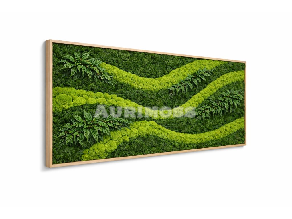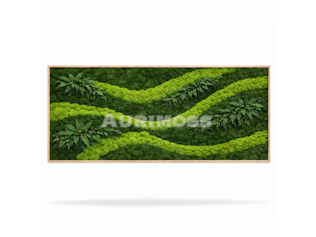 Machový hranatý obraz s mixom machov – Lesné vlnobitie od Aurimoss je luxusný ručne vyrábaný machový obraz zo stabilizovaného machu. Moderná bezúdržbová zelená dekorácia, ktorá prináša do interiéru prirodzenú harmóniu a dynamiku lesa.