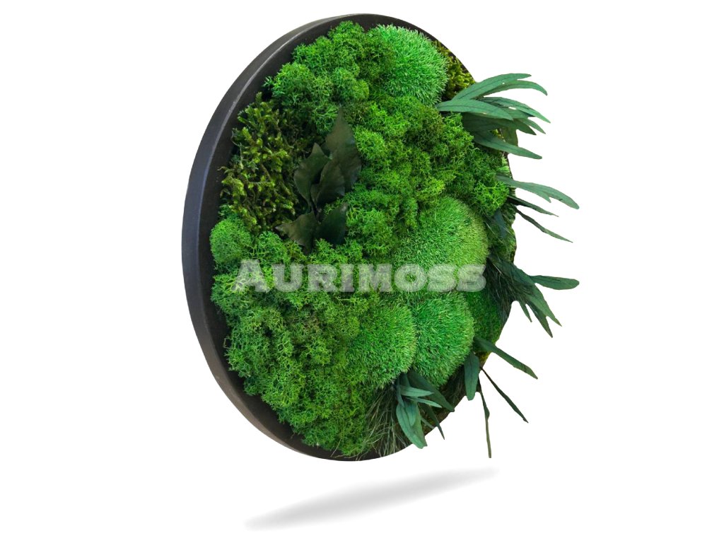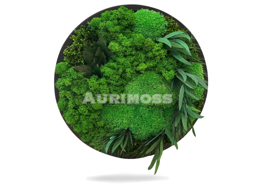 Machový obraz Selénia kombinuje stabilizovaný kopčekový mach, plochý mach a dekoratívne rastliny v elegantnej kruhovej kompozícii. Odtiene sýtej zelene a plastická štruktúra vytvárajú prirodzený 3D efekt.
