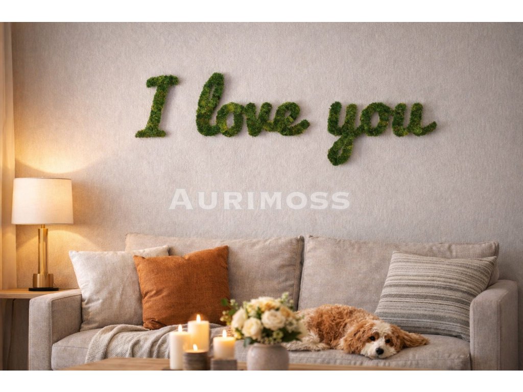Machový nápis s LED podsvietením I Love You od Aurimoss je originálna hand-made dekorácia zo stabilizovaného lišajníka alebo plochého machu. Kombinuje biofilný dizajn s jemným svetlom, čím vytvára romantickú atmosféru v interiéri bez potreby starostlivosti.