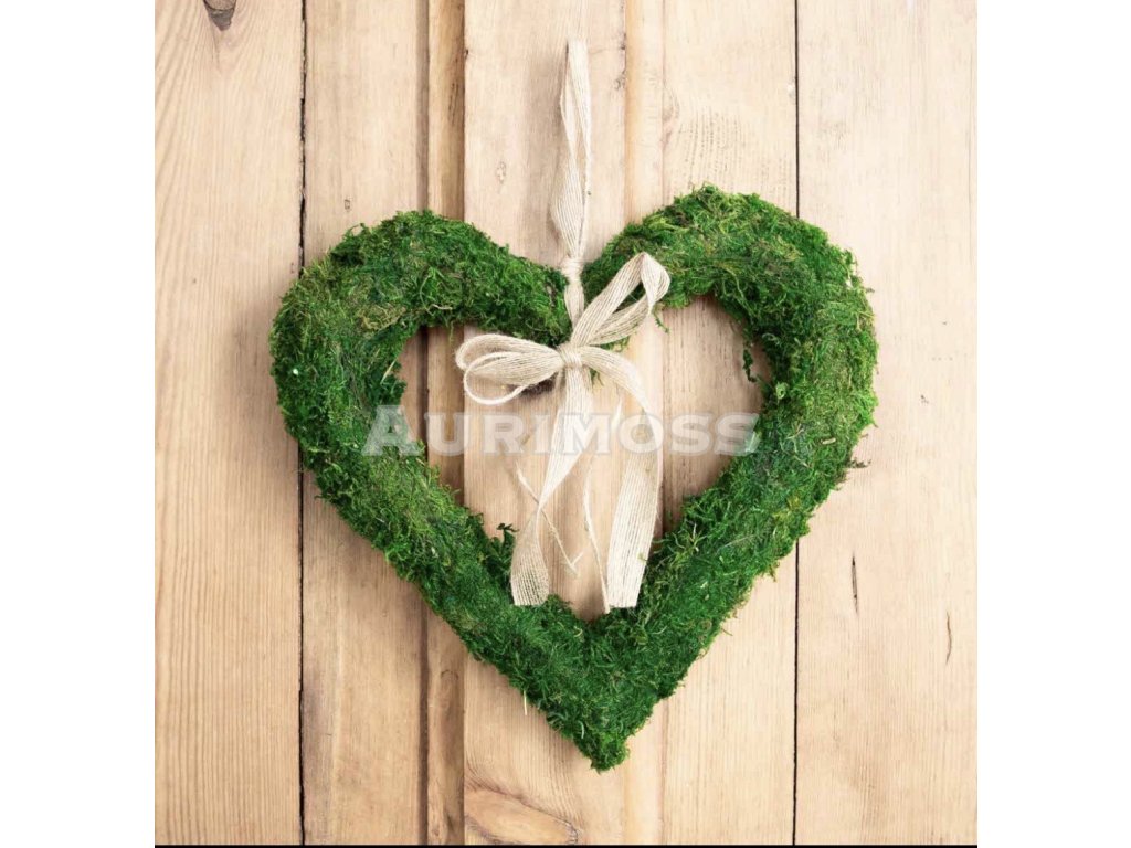 Machový veniec v tvare srdca od Aurimoss je originálna handmade dekorácia z prírodného stabilizovaného machu. Vybrať si môžete medzi lišajníkom alebo plochým machom podľa preferovaného vzhľadu a textúry. Táto machová dekorácia na stenu prináša do priestoru pokoj, harmóniu a dotyk prírody bez potreby starostlivosti.