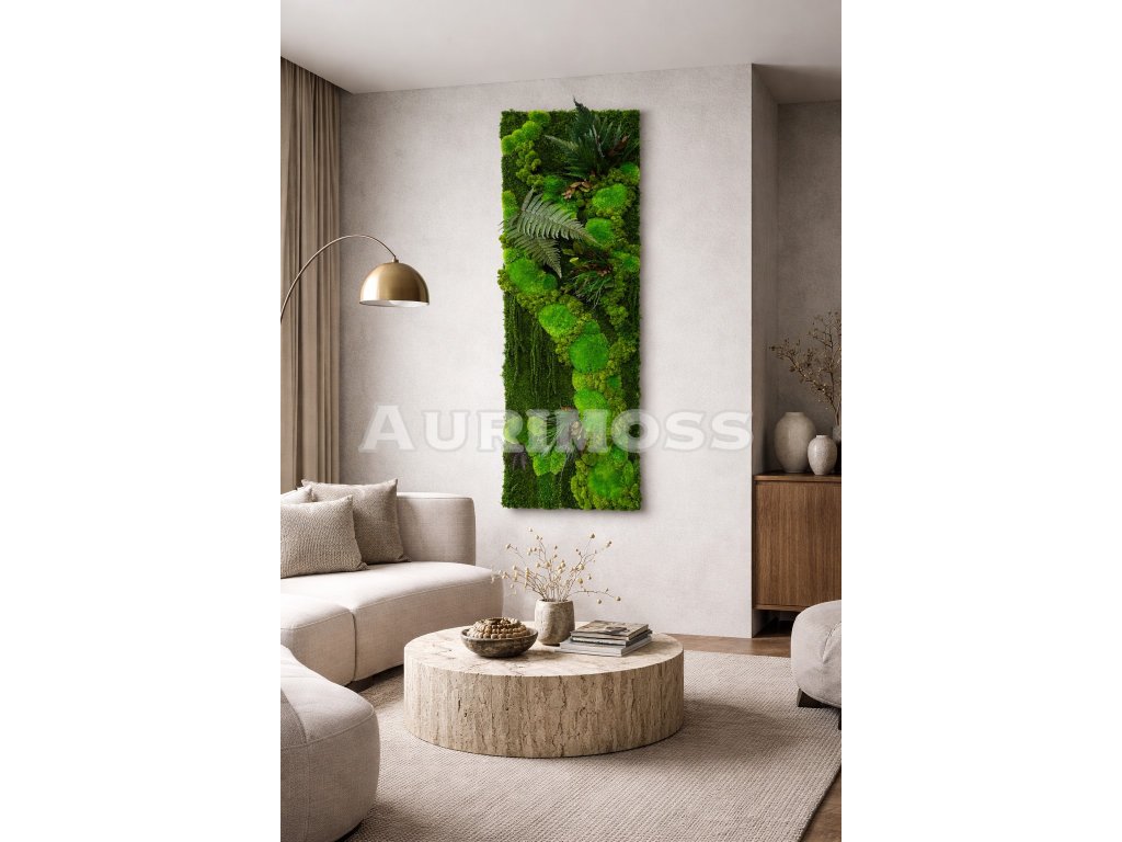 Machový panel s rastlinami Aurimoss je prémiové dizajnové riešenie, ktoré kombinuje mix stabilizovaných machov (lišajník, kopčekový a plochý mach) so starostlivo vybranými stabilizovanými rastlinami. Výsledkom je výrazná zelená stena do interiéru, ktorá pôsobí prirodzene, moderne a reprezentatívne.
