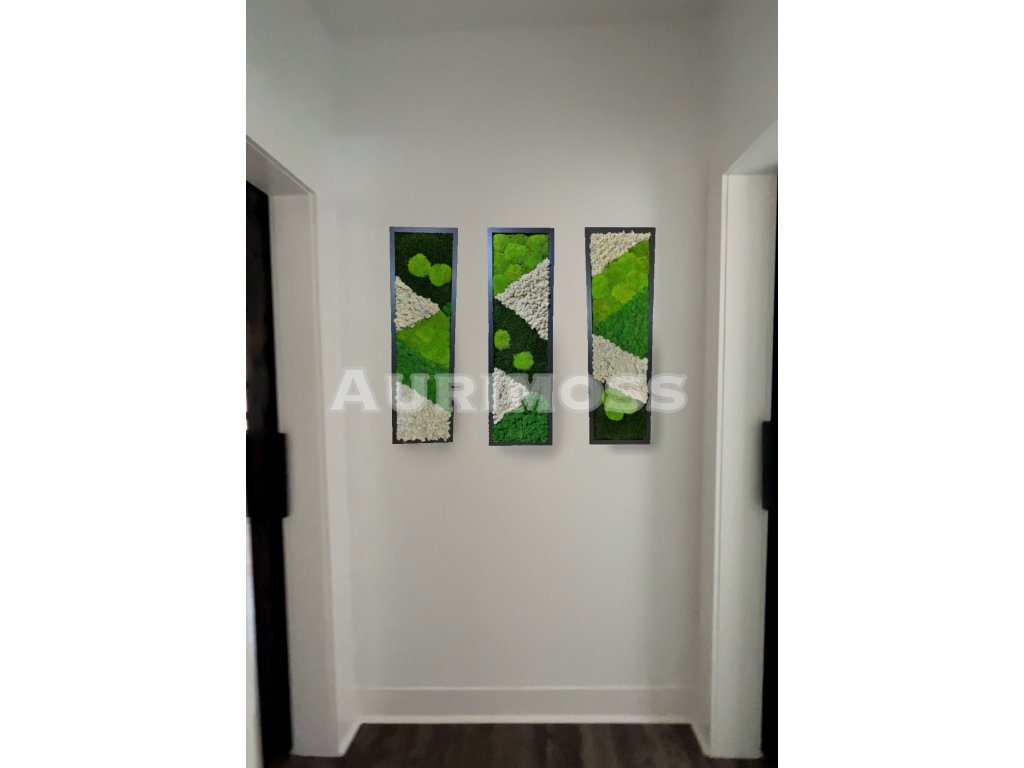 Set Prírodná harmónia je elegantná kompozícia troch machových obrazov v tmavozelenom, svetlozelenom a krémovom odtieni. Spojenie prírodných farieb vytvára vyvážený a upokojujúci vizuálny efekt, ktorý prináša do interiéru pocit pokoja, sviežosti a spojenia s prírodou.